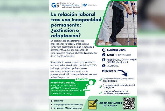 O obxectivo da formación será afondar nas implicacións legais que supón unha invalidez permanente para a relación laboral
