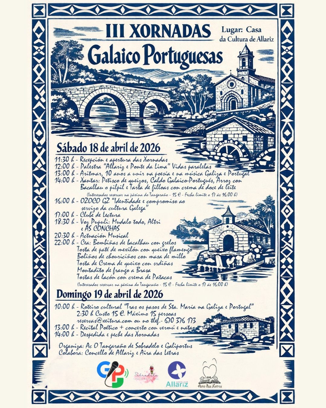 A programación arrancará o sábado 18 de abril cunha xornada dedicada aos encontros culturais e ao intercambio de ideas entre Galicia e Portugal. Tras a recepción e apertura oficial, a mañá incluirá unha charla sobre as paralelidades históricas entre Allariz e Ponte da Lima, seguida da presentación de Aritmar, un proxecto que celebra unha década unindo poesía e música de ambos territorios.