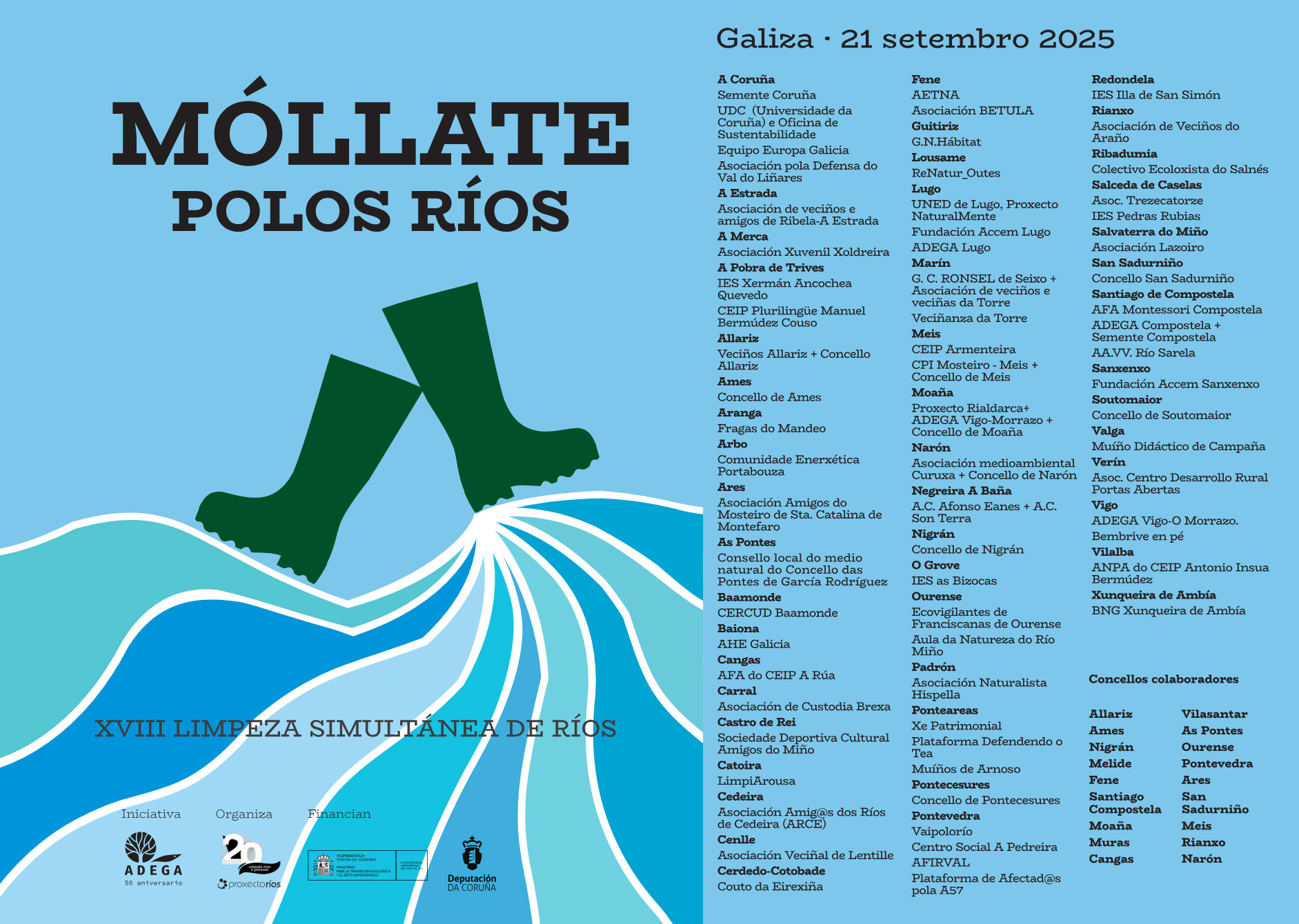 Nesta XVIII edición, a Limpeza Simultánea conta coa colaboración dos concellos de Allariz, Ames, Ares, As Pontes, Cangas, Fene, Meis, Melide, Moaña, Muras, Narón, Nigrán, Ourense, Pontevedra, Rianxo, San Sadurniño, Santiago de Compostela, Tomiño e Vilasantar. A actividade está financiada pola Deputación da Coruña e a Confederación Hidrográfica Miño-Sil, que apoian este esforzo colectivo polo coidado dos nosos ríos.